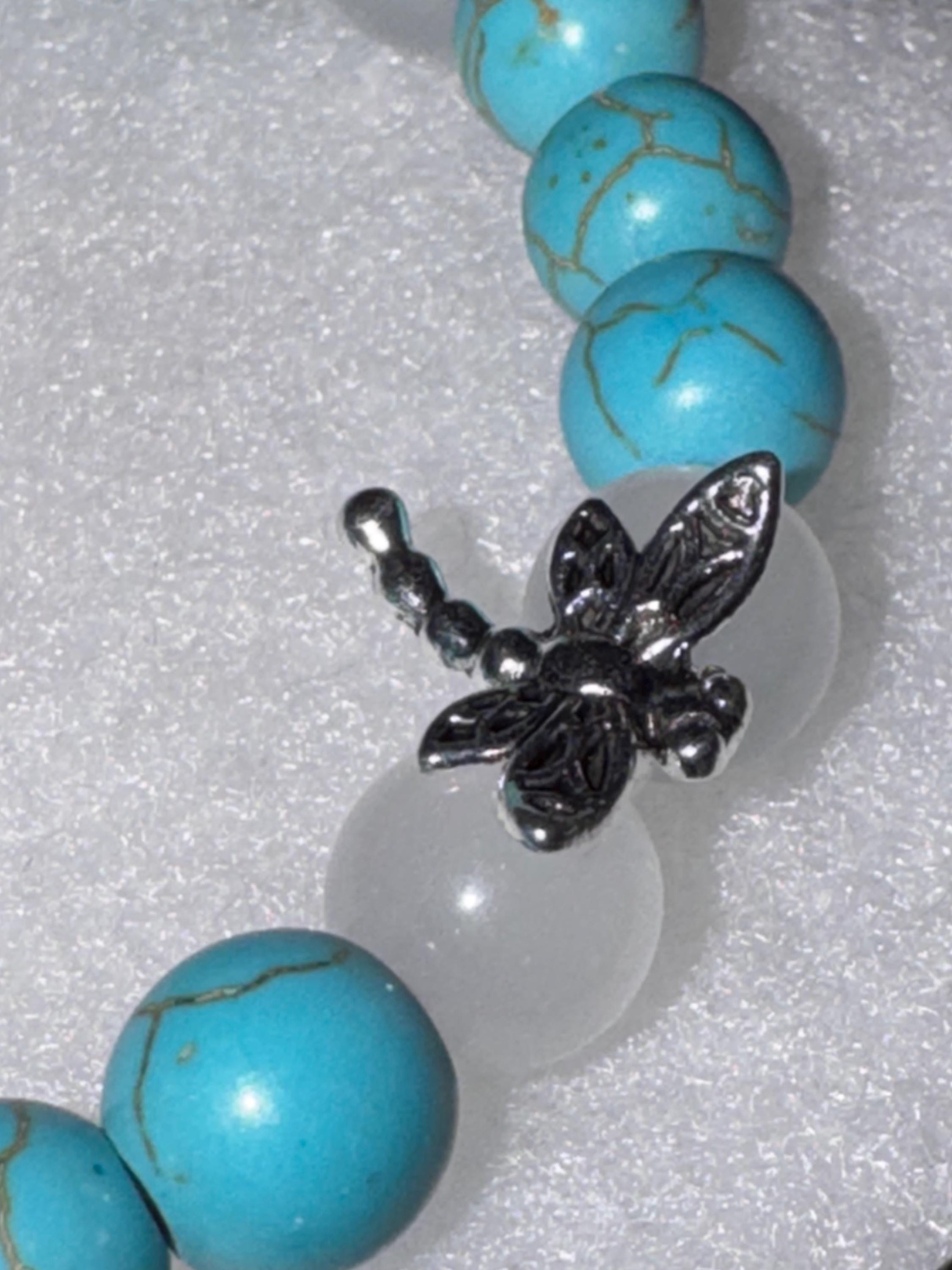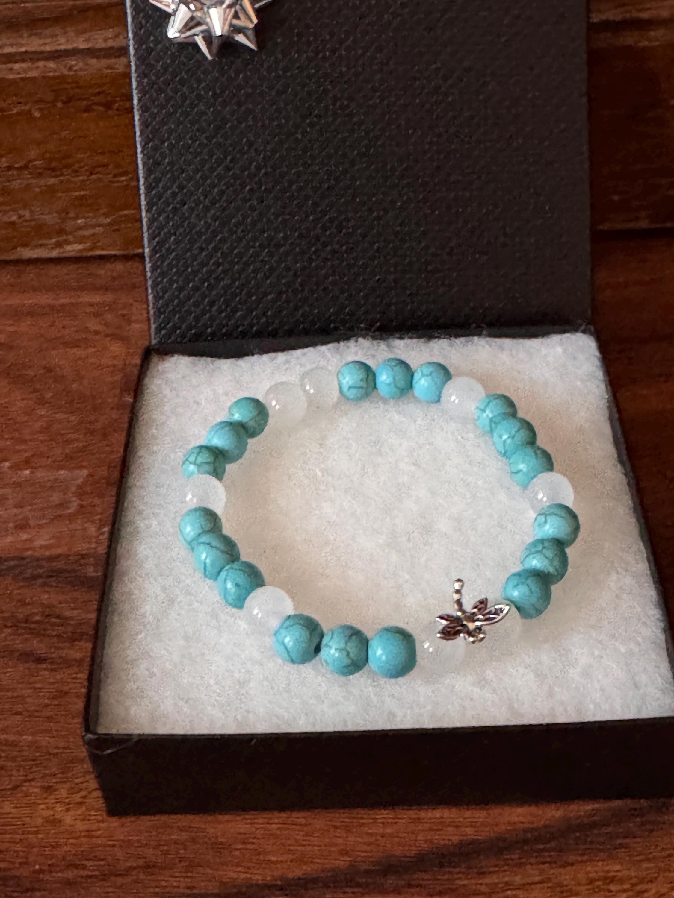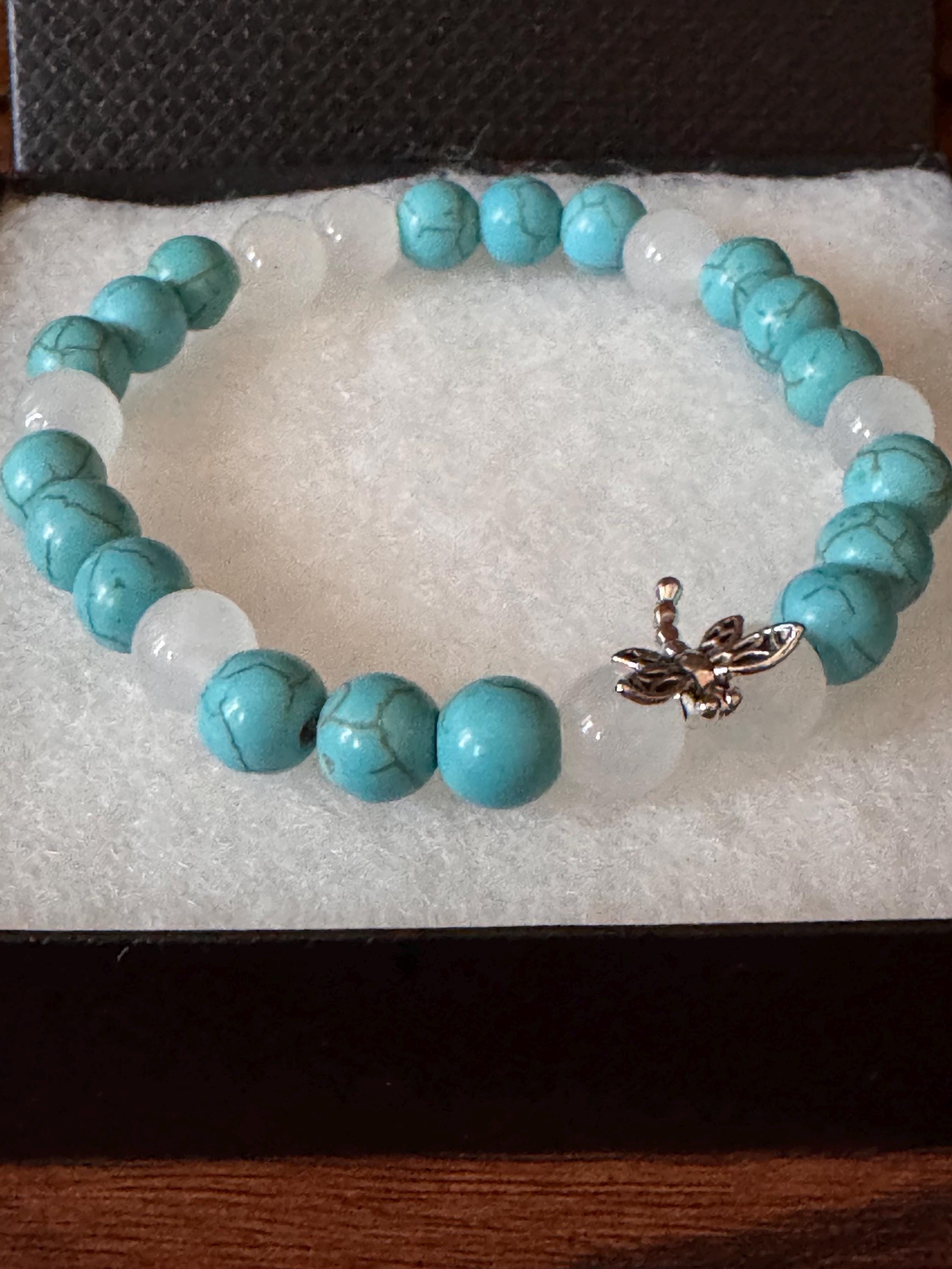 Add a touch of elegance and nature-inspired beauty to your jewelry collection with this handmade beaded stretch bracelet. Featuring smooth jade-colored gemstone beads paired with crisp white glass beads, this bracelet is accented with a delicate dragonfly charm for a whimsical finish.