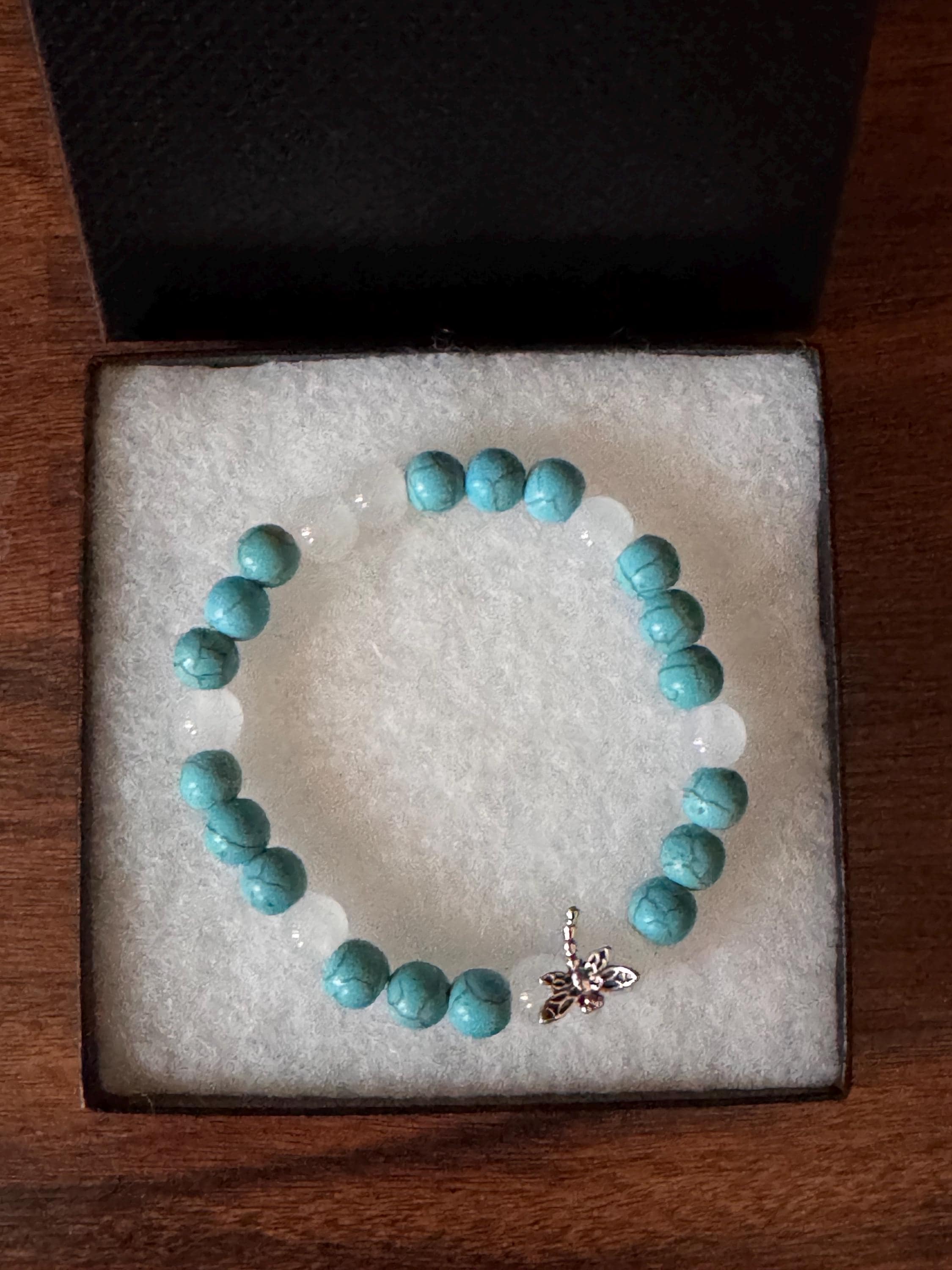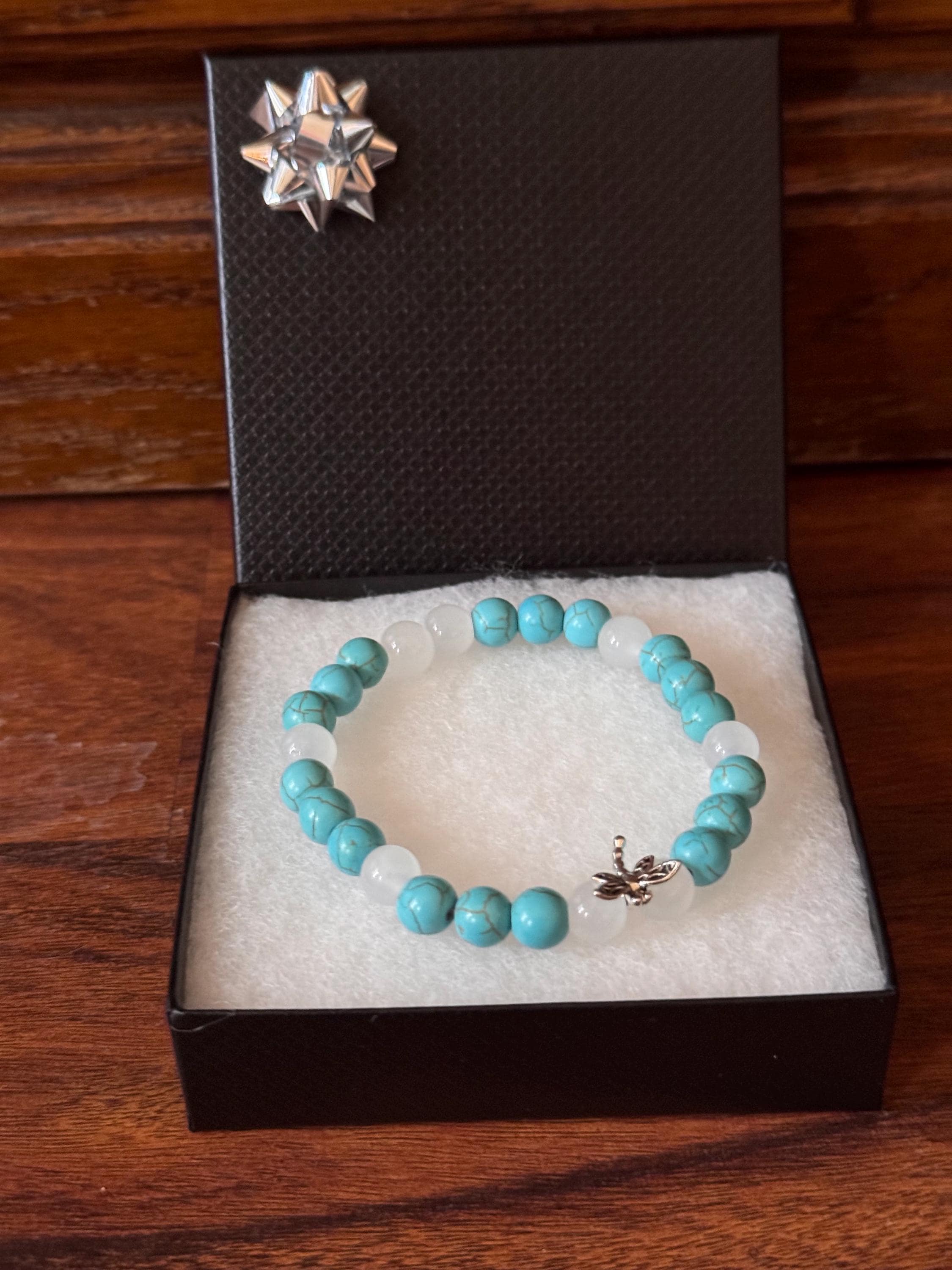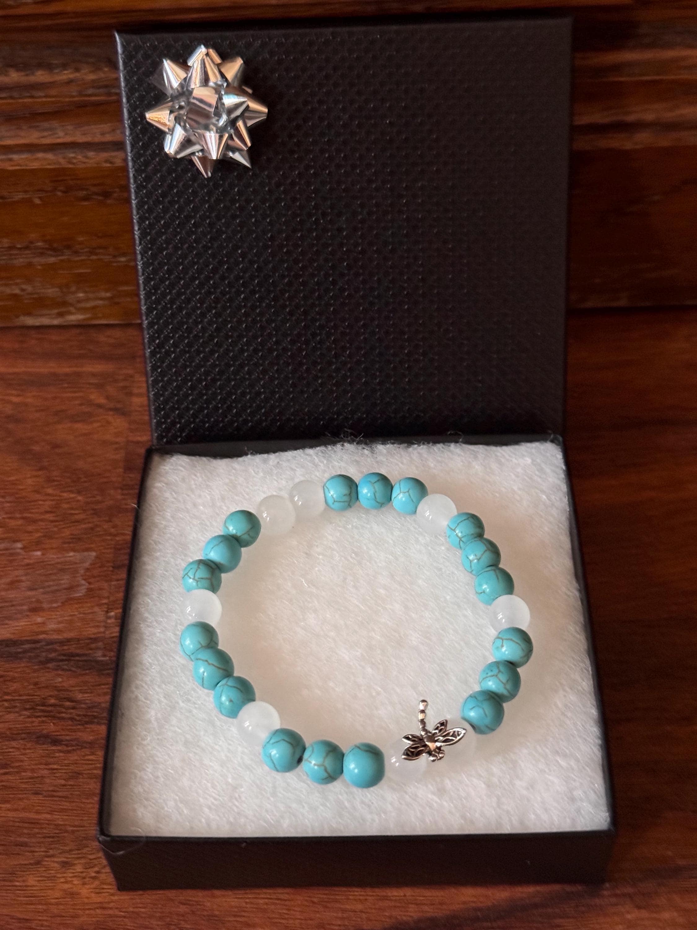 Add a touch of elegance and nature-inspired beauty to your jewelry collection with this handmade beaded stretch bracelet. Featuring smooth jade-colored gemstone beads paired with crisp white glass beads, this bracelet is accented with a delicate dragonfly charm for a whimsical finish.