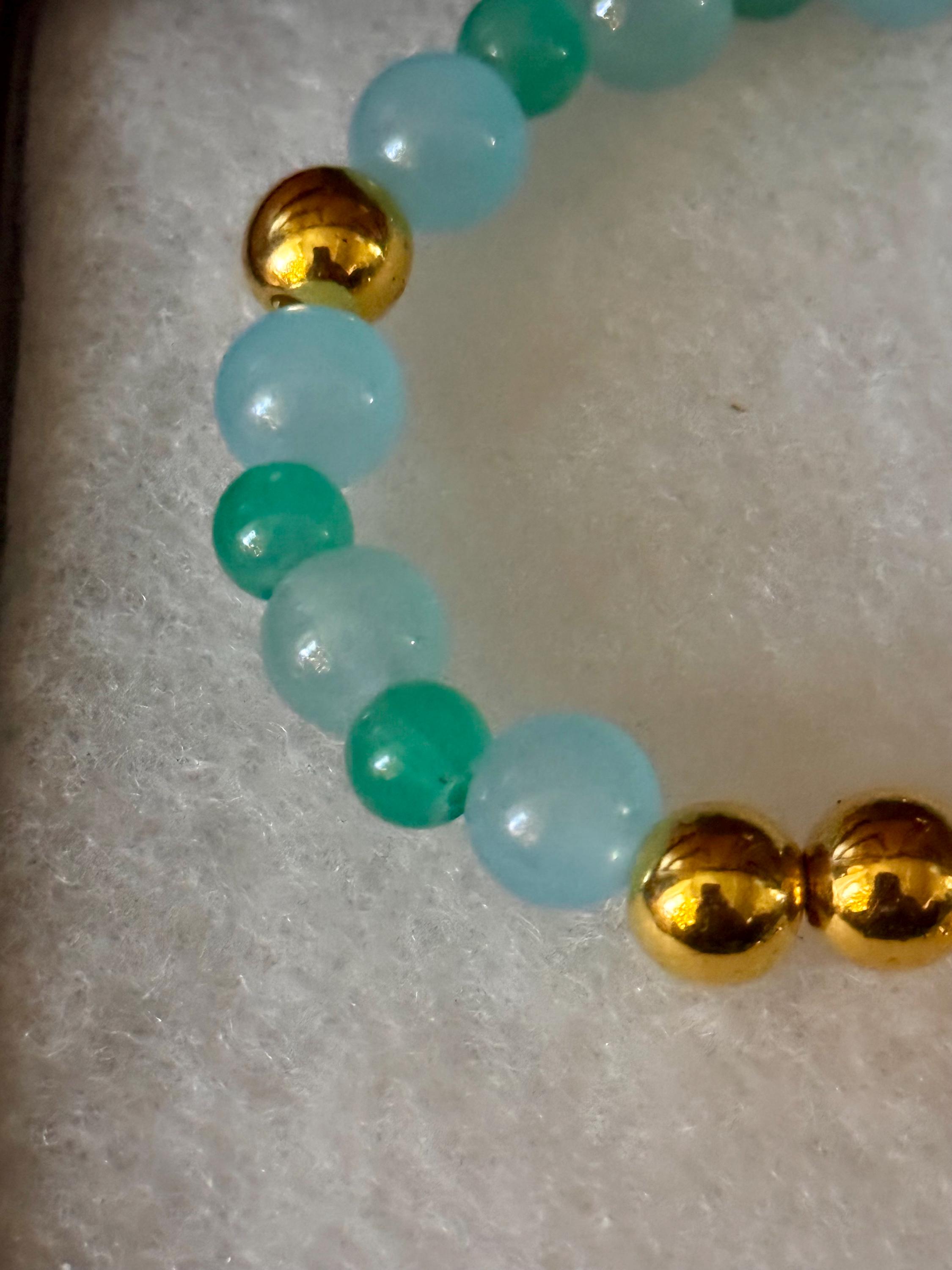 • All round beads are high-quality glass in soothing aqua and green tones.