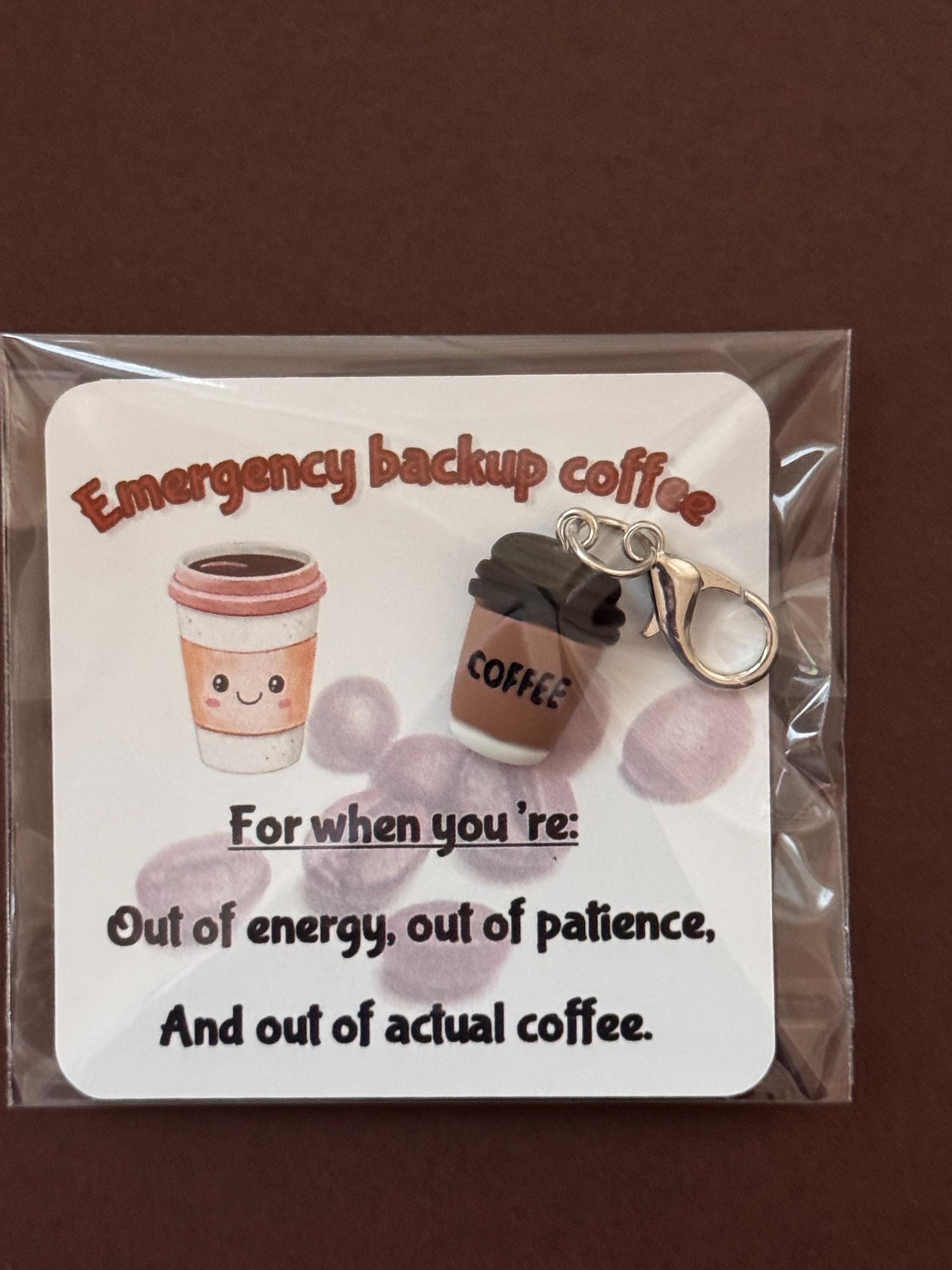 Brighten someone’s day with this playful Emergency Backup Coffee keychain charm! This adorable miniature coffee‑cup charm comes attached to a themed backing card, making it a fun and lighthearted gift for anyone who runs on caffeine and humor.